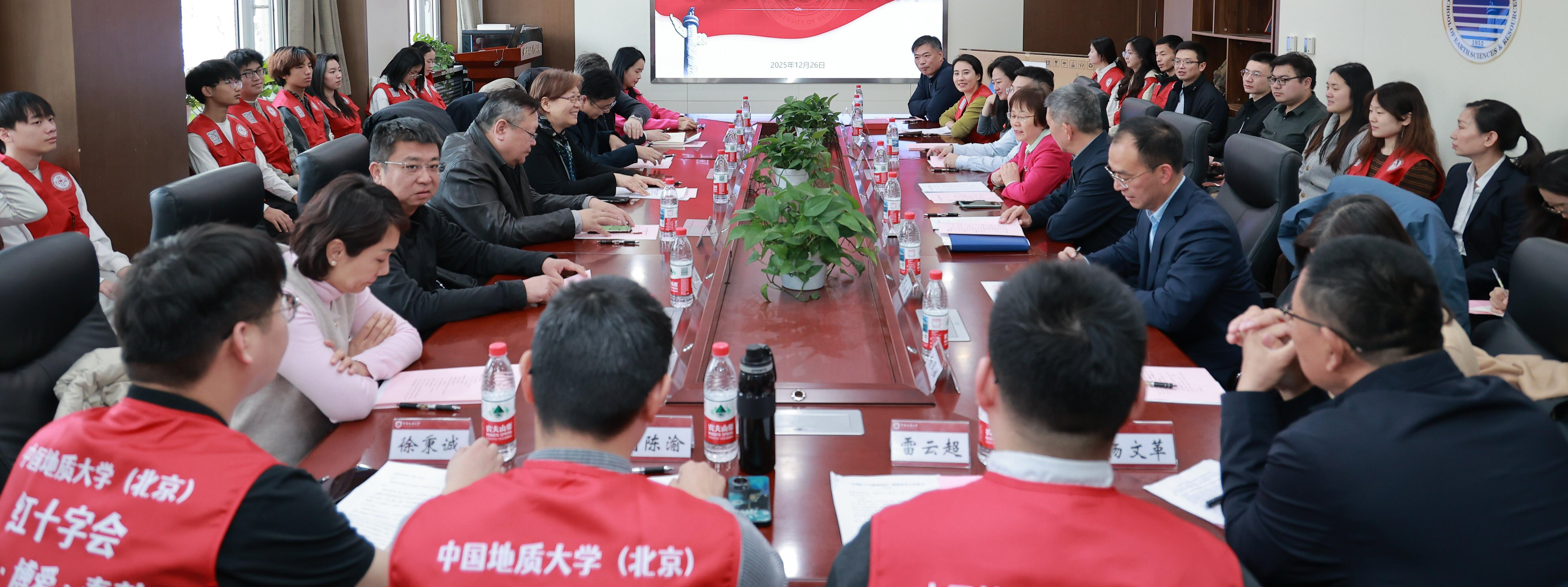 2025年12月26日下午,北京市红十字会党组书记、常务副会长高坚带队到中国地质大学(北京)就高校红十字工作进行调研座谈,副会长郭昊、海淀区红十字会党组书记高毅随同调研。中国地质大学(北京)党委书记雷涯邻出席座谈会并致辞,党委副书记林善园主持会议。市、区红十字会相关工作负责同志,学校团委、校医院负责人,部分学院党委(支部)书记,学校红十字工作相关老师、学生代表参加座谈。