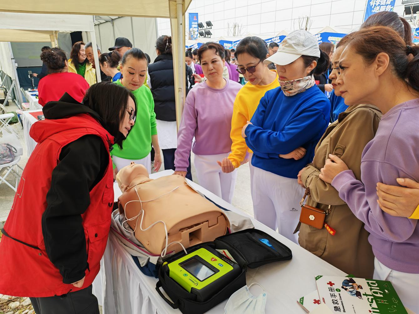 朝阳区红十字会紧扣“体卫融合”主题,将应急救护技能培训融入全民健身场景,通过模拟演练、互动教学等方式,向参与市民传授心肺复苏、AED使用等关键急救技术,并普及运动损伤处理、突发意外应对等实用知识,助力构建“运动+健康+安全”的立体化保障体系。